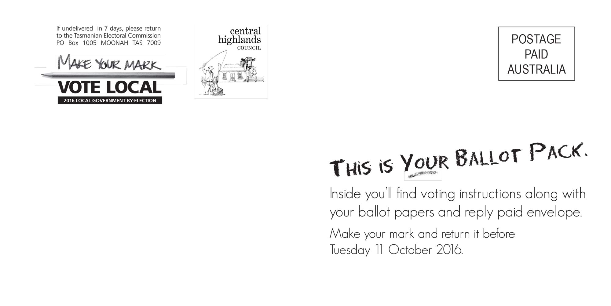 This means there is a 'polling period', rather than one polling day as for state Parliamentary elections. Every elector will be sent their very own postal ballot pack at their postal address. You then have around 4 weeks to complete and post your vote back to the returning officer. In 2016 the Central Highland by-elections polling period is between Tuesday 13 September to 10am Tuesday 11 October.