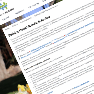 Following community concerns surrounding planning approval requests in 2017, the City of Hobart commissioned an architect and urban design consultant to undertake a Building Heights Standards Review (the Review) in order to ensure the height of development in the central area of Hobart and Sullivans Cove makes a positive contribution to the streetscape and townscape values and meets community expectations.